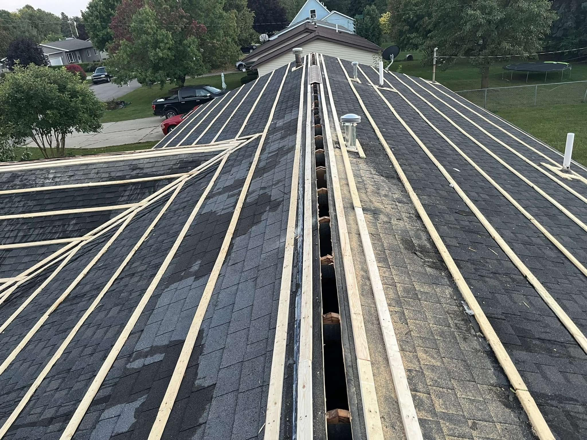 When the roof is complete, you notice a uniform appearance with no missing or damaged shingles, properly sealed edges and valleys, and updated flashing around all roof features. Water runs off the roof as intended, attic ventilation is restored or improved, and the home is protected from leaks and weather exposure. The new roof improves both function and appearance.